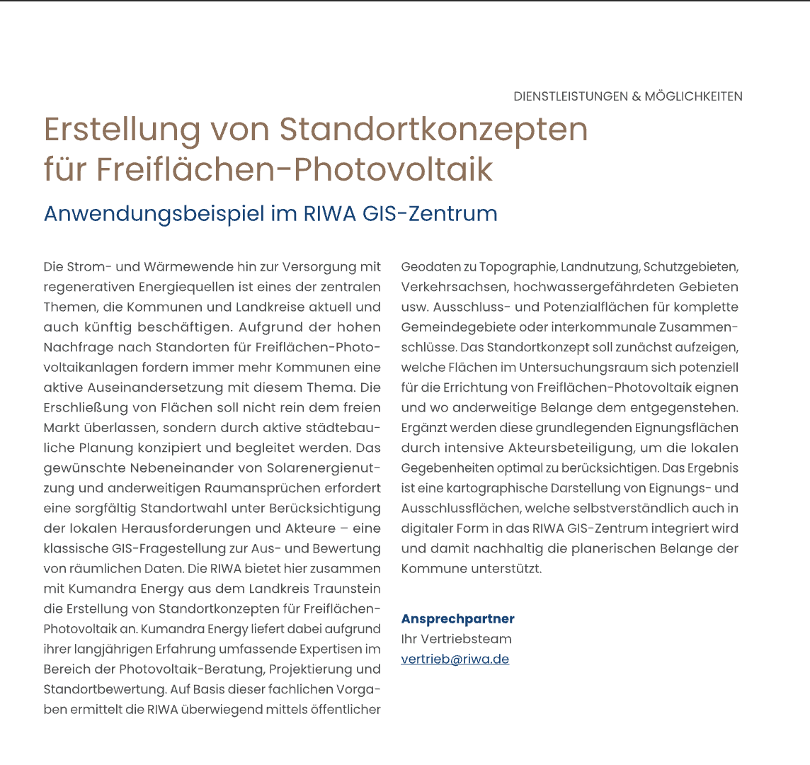 Wir liefern dabei - aufgrund unserer langjährigen Erfahrung und Expertise im Bereich der Photovoltaik-Beratung, Projektierung und Standortbewertung - einen umfassenden Kriterienkatalog für die Definition von Eignungs- und Ausschlussflächen. Auf Basis dieser fachlichen Vorgaben ermittelt die RIWA - überwiegend mittels öffentlicher Geodaten zu Topographie, Landnutzung, Schutzgebieten, Verkehrsachsen, hochwassergefährdeten Gebieten usw. - Ausschluss- und Potenzialflächen für komplette Gemeindegebiete oder interkommunale Zusammenschlüsse.